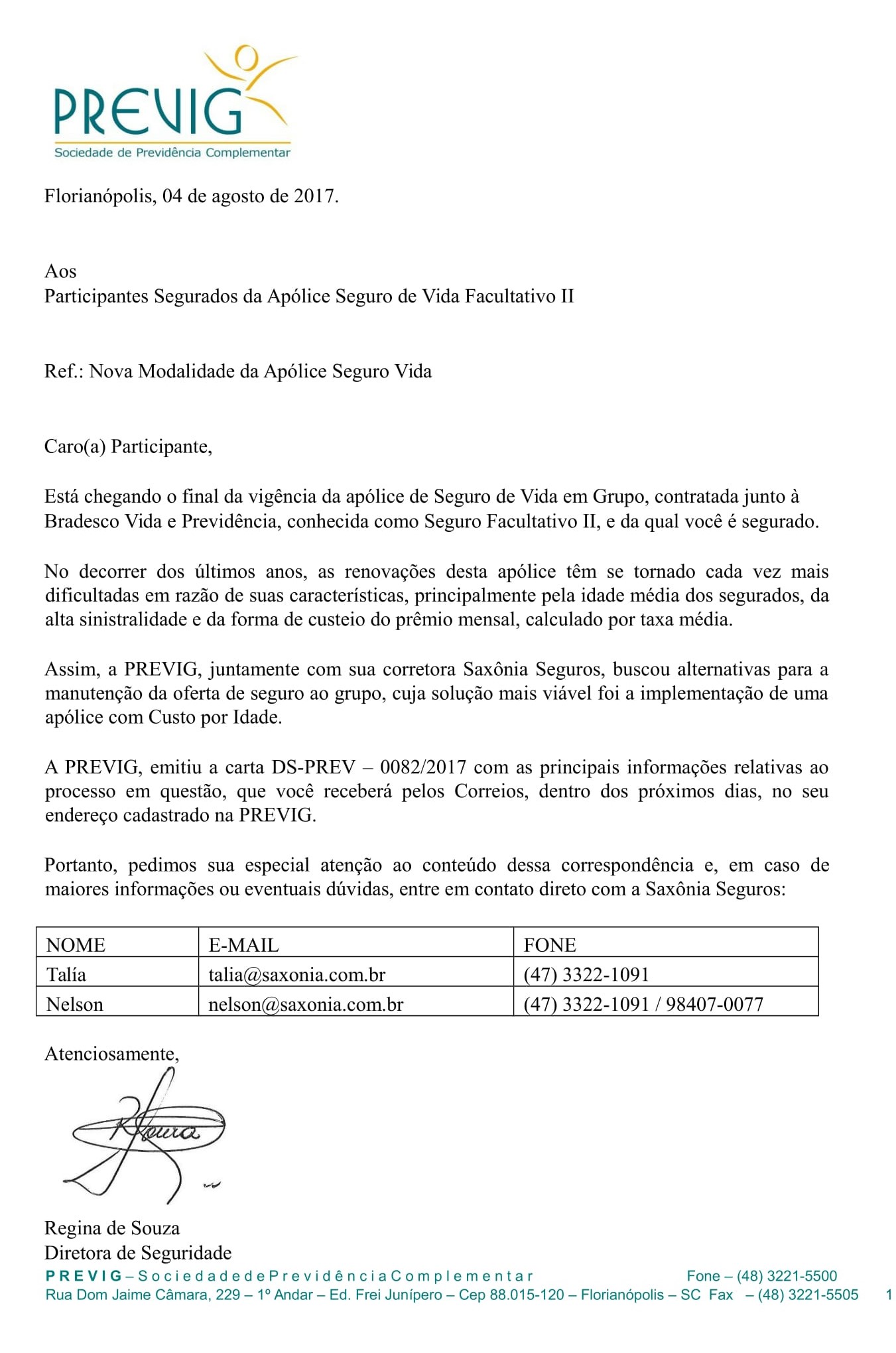 Confira, abaixo, correspondência da Previg sobre o fim da vigência da apólice de Seguro de Vida em Grupo, contratada junto à Bradesco Vida e Previdência.